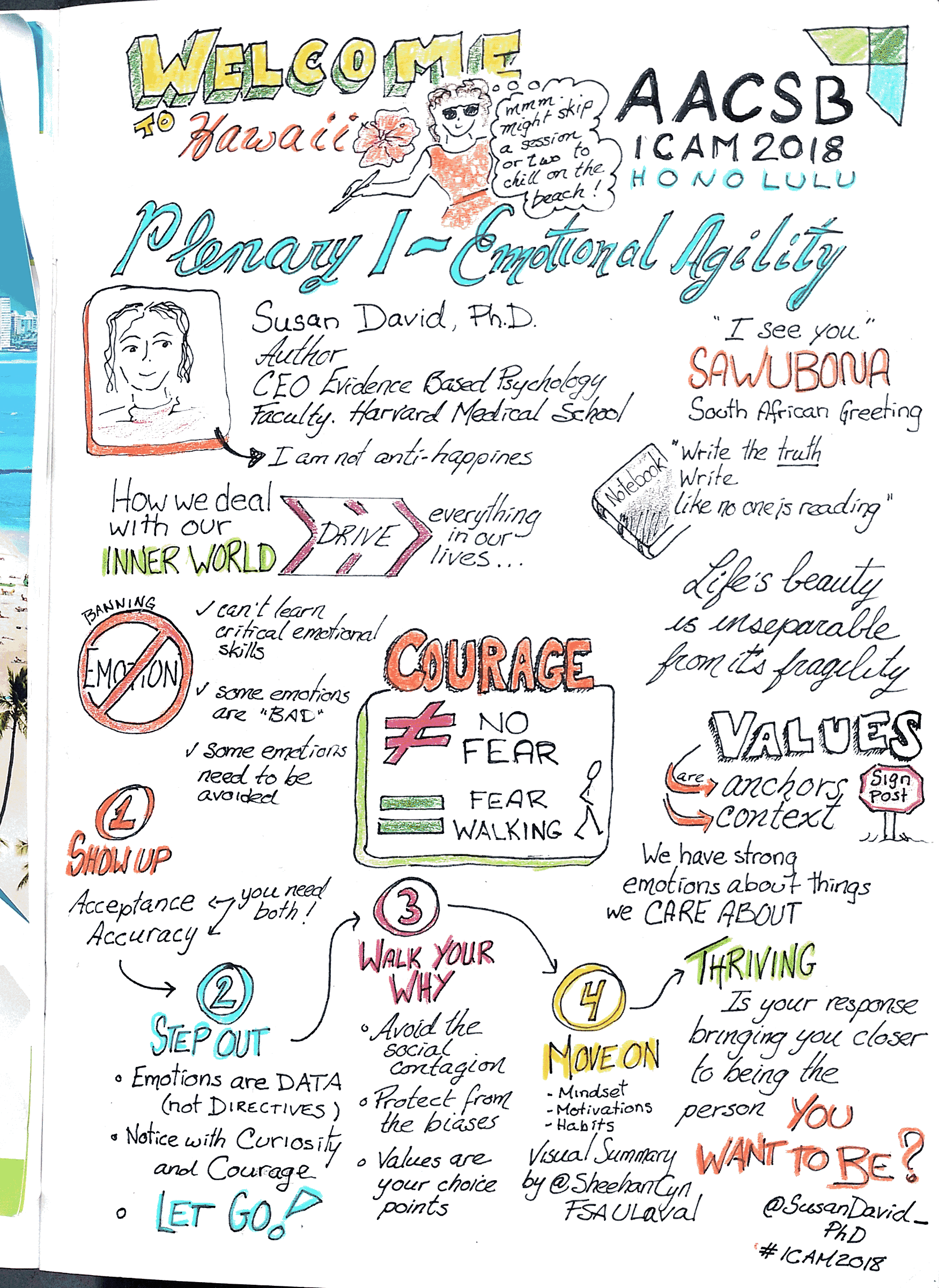 Sketchnote of ICAM Plenary session on Emotional Agility by Susan David, Honolulu 2018 AACSB. Sketchnote by Cynthia Sheehan